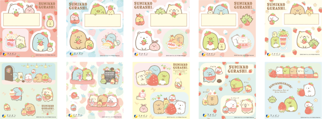 全部で10種類のすみっコぐらしがデザインされた限定シールが1袋につきランダムで1枚おまけとして付いてきます。キャラクター達がイチゴ柄のエプロンをつけていたり、イチゴの帽子をかぶっていたりと、色々な様子のすみっコぐらしが登場します。