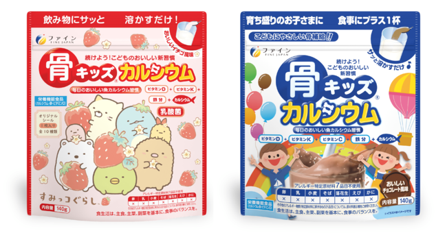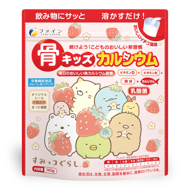 健康食品及び医薬品などを製造・販売する株式会社ファイン(本社:大阪市東淀川区、代表取締役:佐々木 信綱)は、毎日の栄養バランスを美味しくサポートする『骨キッズ(R)カルシウム』シリーズに、大人気キャラクター“すみっコぐらし” をデザインしたパッケージ『骨キッズ(R)カルシウム イチゴ風味(すみっコぐらし)』と、パッケージと成分をリニューアルした『骨キッズ(R)カルシウム チョコレート風味』を、令和4年2月17日(木)より全国のドラッグストア・自社ネットショップにて販売開始します。(イチゴ風味(すみっコぐらし)製品紹介URL:https://www.fine-kagaku.co.jp/products/detail/491 )