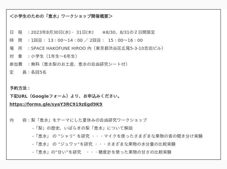 夏休み最後の駆け込み寺的 「梨」のワークショップ。旬を迎えたブランド梨「恵水」で涼をとっていただくために、ひんやりと冷やした「恵水」の無料ふるまいも同時開催します!