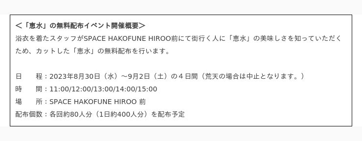 また本イベントでは、8月30日(水)~9月2日(土)4日間、浴衣を着たスタッフがSPACE HAKOFUNE HIROO前にて、街行く人に「恵水」で涼をとっていただくため、ひんやりと冷やした「恵水」を無料で振る舞う「恵水」の無料配布イベントも併催します。