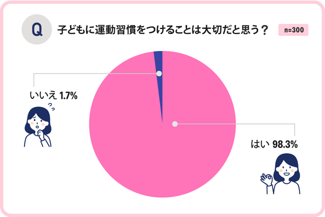 100%に近い保護者の方が「運動習慣をつけることは大切」と思われており、子どもが運動不足と感じている保護者の方は5割に上りました。