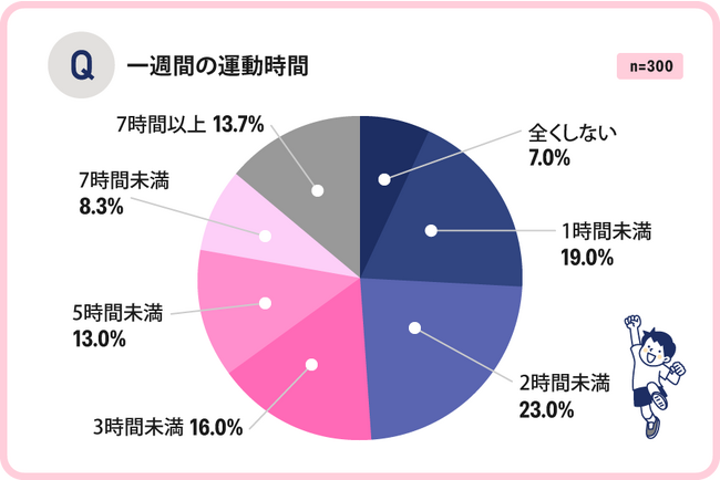 続いて「1時間未満」が19.0%、一週間運動を「全くしない」という回答も7.0%ありました。