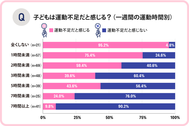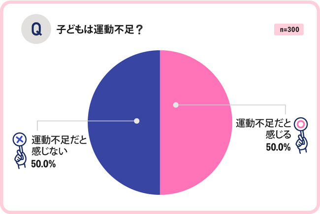 出典: ママソレ|【2023年最新】子どもの週の運動時間は?運動不足は気になる?パパママ300人に子どもの運動習慣についてアンケート!