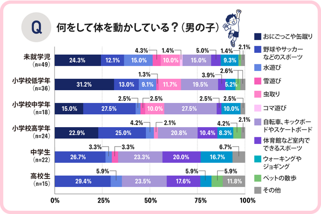 男の子の回答としては、全年齢を通じて「野球やサッカーなどのスポーツ」が多く、次に「自転車、キックボードやスケートボード」が多い結果となりました。