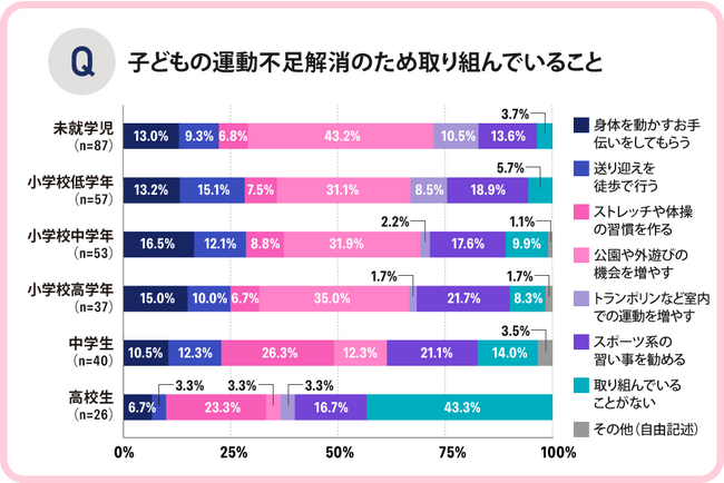 また、高校生では「取り組んでいることがない」が最も多い結果となり、年齢が上がるにつれ親が子どもの運動不足解消のために手助けをすることは難しいことが分かります。