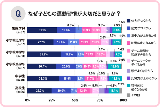 また、「肥満防止になるから」や「精神的に強くなるから」の回答がどの年齢でも1割ほどありました。