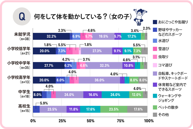 女の子の回答としては全年齢を通じて「自転車、キックボードやスケートボード」が多い結果となりました。