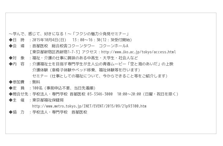 医療・福祉からスポーツまで、即戦力を育成する学校法人・専門学校 首都医校(http://www.iko.ac.jp/)にて、福祉の仕事を目指している中高校生や福祉活動に興味・関心のある方を対象とした東京都主催の一般公開セミナー「フクシの魅力☆発見セミナー」が10月4日に開催されます。