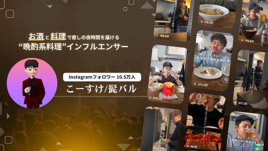 「こーすけ / 髭バル」は、料理とお酒をこよなく愛する独身男・こーすけが、一人で開く“深夜のバル”をコンセプトにしたキャラクター。手軽でおしゃれな家飲みレシピや、大人の夜時間を演出するSNS投稿が共感を集め、TikTokフォロワー4万人・Instagramフォロワー10.5万人を突破しています。