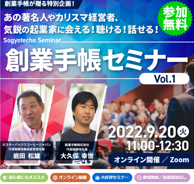 今回は、元スターバックスジャパン代表取締役最高経営責任者 岩田松雄氏 が登場、『創業手帳×岩田松雄のミッション道場』を開催します。