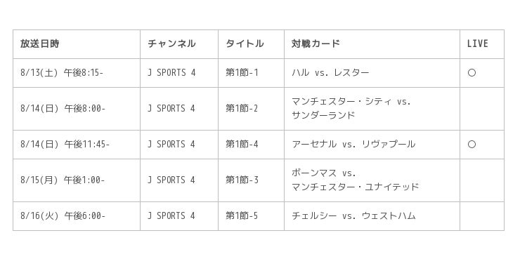 今シーズンも見どころ満載のプレミアリーグ、開幕節は下記5試合を放送します。