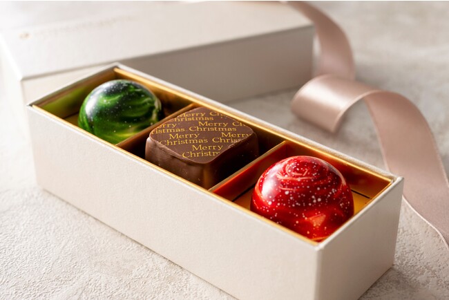 ホテルのショコラティエがひとつひとつ丁寧に作り上げる、濃厚で口どけ滑らかなボンボンショコラにクリスマス限定フレーバー3種が登場。繊細な甘みとエレガントな香りが広がる「シャンパン」、ラズベリーの甘酸っぱさがバニラの優しい甘みを引き立てる「ラズベリーバニラ」、レモンチェッロの爽やかな味わいが際立つ「プラリネシトロン」と、いずれもフェスティブシーズンならではの華やかなフレーバーが揃います。