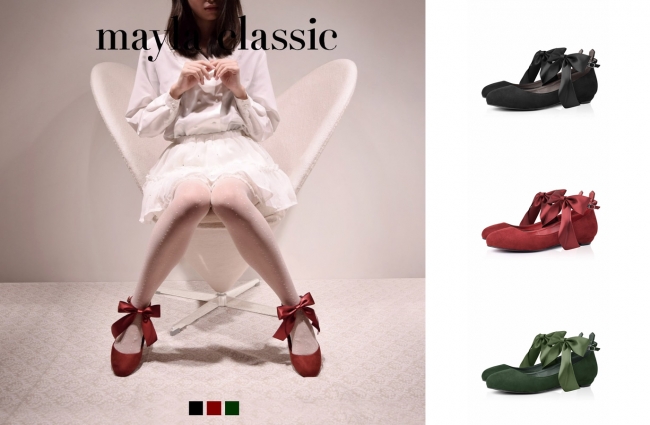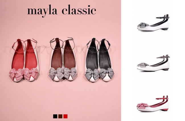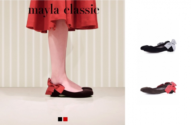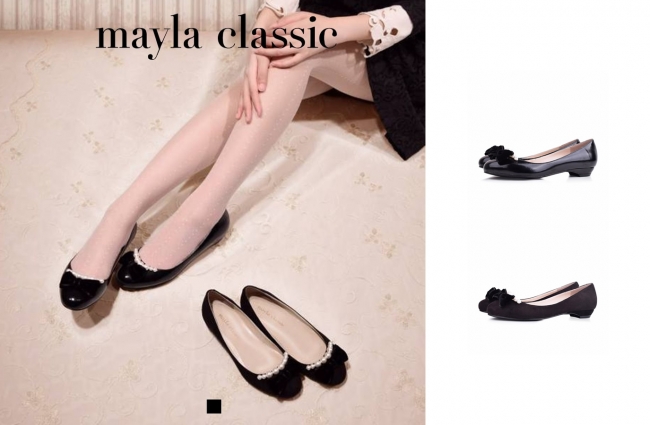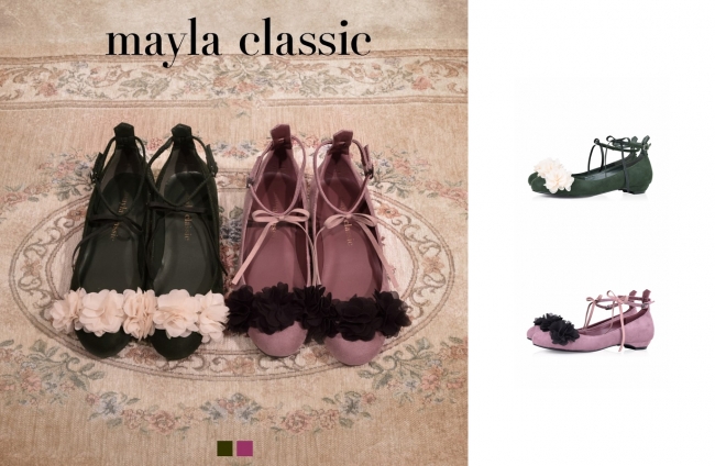 以前より、多くの女性のお客様よりお声を頂戴しておりました「可愛いけどヒールが高くて履けない」、「フラットシューズしか履けないのに可愛いのがない」。 こちらのお声にお応えするため、mayla classicはフラットシューズ6アイテムをリリース致しました。