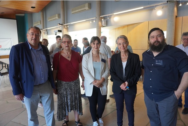 ツナガルのメンバーがフランス首相のエリザベス・ボルヌ氏(右から2番目)およびヴィール市長サバテール氏(左端)を表敬訪問。NOMADOプロジェクトの開催場所であるヴィ―ル市で最も注目すべきニュースとして紹介させていただきました。フランスと日本の地方都市同士をきっかけに、テクノロジーを活用した国際的な交流が生まれていることの意義が伝わり、ボルヌ氏は深く感銘を受けました。