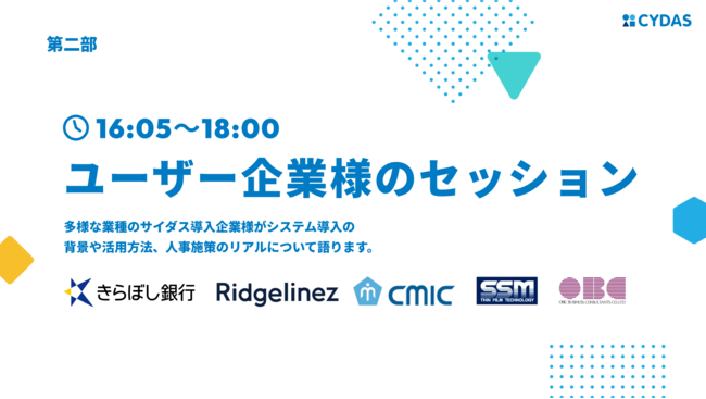 16時からの第2部では、CYDAS PEOPLEのユーザー企業の皆様にご登壇いただき、サイダスのタレントマネジメントのリアルな活用方法やこれから期待することについてお話しいただきます。