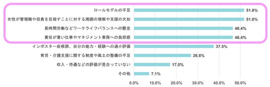 「ロールモデルの不足」「女性が管理職や役員を目指すことに対する周囲の理解や支援の欠如」51.8%で同率トップ。続いて、「長時間労働などワークライフバランスへの懸念」「責任が重い仕事やマネジメント業務への負担感」が46.4%。