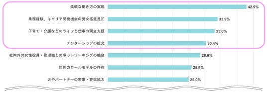 女性役員や女性管理職を増やすために必要なこととして、「柔軟な働き方の実現(フレックスタイム、リモートワークなど)」「業務経験、キャリア開発機会の男女格差是正(新規プロジェクトの企画提案など)」「子育て・介護などのライフと仕事の両立支援(育児休業、介護休業、短時間勤務制度など)」「メンターシップの拡充」が上位にあげられた。