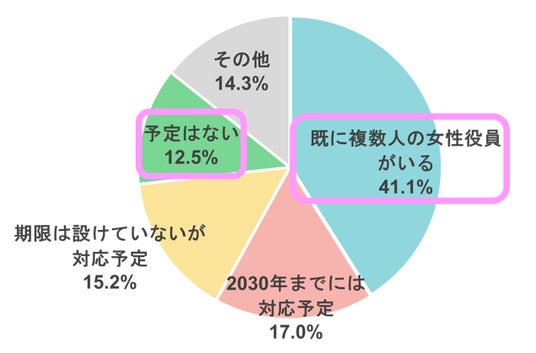 「既に複数人」が4割以上の一方で、「予定はない」が1割以上となった。「2030年までに対応予定)」は17.0%、「期限は設けていないが対応予定」が15.2%。