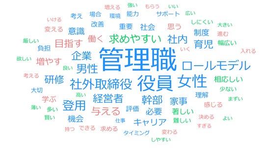 「製造業のため、男性比率が大きく、そもそも管理職を目指そうと思っている女性社員がいない。打ち手としては女性管理職サクセッションプランを作成し、育成する取組みがない限りは、女性管理職はそもそも生まれない。」(50代 取締役)