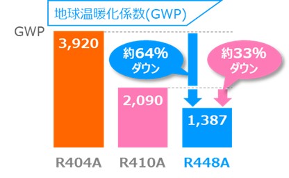 R448 Aは次世代冷媒ともよばれ、地球温暖化係数(GWP)が従来の冷媒R404Aと比較して約64%、R410A比では約33%低減した冷媒です。これにより、フロン排出抑制法に基づく環境影響度の目標達成度「A」を達成しました。