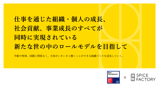スパイスファクトリー株式会社(東京都台東区、代表取締役CEO:高木 広之介)は、世界60カ国7,000社を超える企業の働きがい調査を行うGreat Place to Work(R) Institute Japanが選出する、2022年版日本における「働きがいのある会社」ランキング ベスト100に選出されました。