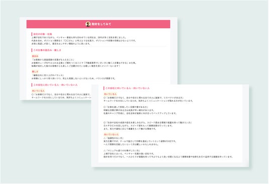 取材項目は、その企業に「向いている人物像」、業務における「面白み」や「難しさ」など、求人票には記載されていないディープな内容が盛沢山です。