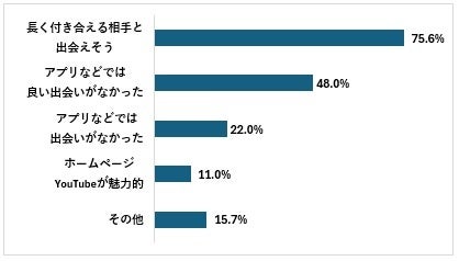 「長く付き合える相手と出会えそう」が75.6% と圧倒的に高く、多くのユーザーが短期的な関係ではなく、将来を見据えた真剣な交際を求めていることが明確です。