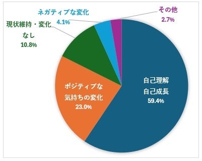 自由回答をまとめたところ、大きく5つの傾向に分類されました。その中で「自己理解・自己成長」が59.4% と最も高く、さらに23.0%の「ポジティブな気持ちの変化」も良い変化の一部と捉えると、全体の約8割ものユーザーがリザライでの活動を通じて、前向きな変化を実感していることが明らかになりました。