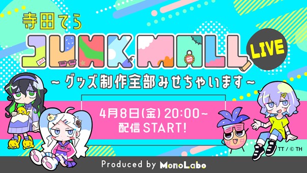 幅広いマーケティングソリューションを提供する株式会社CDG(本社:大阪市北区、代表取締役社長:小西 秀央、以下「CDG」)は、視聴者参加型でアニメキャラクターなどのグッズ開発を行うオンラインライブ配信チャンネル「MonoLabo Channel(モノラボ・チャンネル)」の企画第4弾として、『ジャンクモール』とコラボし、「寺田てら『ジャンクモール』LIVE~グッズ制作全部みせちゃいます~」を4月8日(金)に開催することが決定しました。