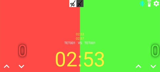 当システムはエペとフルーレの2種目に対応しています。アプリを起動させると、スマートフォンと専用送信機がBluetoothで接続され、専用送信機単体ではエペ、付属のフルーレ用ケーブルを接続するとフルーレがプレーできます。アプリでは、通常のファイティング(3分:試合形式の練習)や延長戦(1分)はもちろんのこと、試合時間や打突判定時間を任意に変更することが可能です。さらに、各選手の得点履歴を時系列で記録し、画面中央部に表示する機能を有しております。アプリをインストールしたスマートフォンをもう1台接続すると、審判用リモコンとして使用することができ、タイマー始動や得点追加などを操作することも可能です。