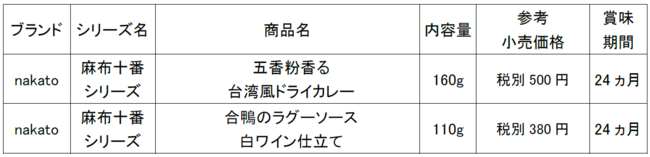 中島董商店(ナカシマトウショウテン、本社:渋谷区渋谷1-4-13、代表取締役社長:中島周)は、nakatoブランドで展開する「麻布十番シリーズ」から『五香粉香る 台湾風ドライカレー』と『合鴨のラグーソース 白ワイン仕立て』を2月25日(金)に新発売します。