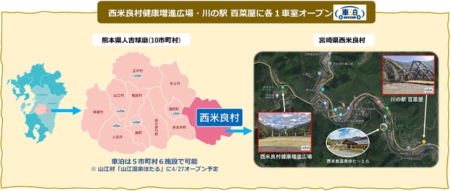 この度、西米良村は宮崎県の補助事業を活用して、九州周遊観光活性化コンソーシアム(代表機関:トラストパーク株式会社 本社:福岡県福岡市博多区、代表取締役:山川 修)が各地の観光振興を目的として広域に展開している車泊(くるまはく)・RVパークsmartを中山間2地域「川の駅 百菜屋」、「西米良村健康増進広場」に導入し、官民連携により事業を開始しましたのでご報告いたします。