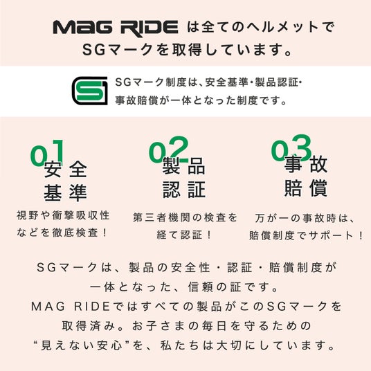 ・自転車用のSGマーク取得済み。デザイン性や多彩な用途だけでなく、しっかりした安全性能を備えています。マグライドは販売している全てのヘルメットでSGマークを取得しています。