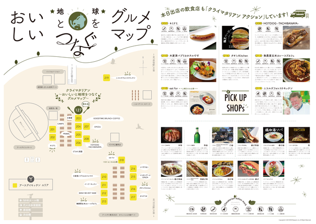 環境にやさしい食材を選び、自然の恵そのままを味わったり、伝統的な食を楽しんだりできる出店者が勢揃いするフードエリア「アースデイキッチン」においてクライマタリアンを体感できるグルメマップを展開します。クライマタリアンとは、地球環境のために、食由来の温室効果ガスの排出量を減らすよう配慮した食生活を選択する人のことを指します。フードロスや地産地消、ヴィーガン、代替肉など、飲食出店者の環境に対するこだわりをチェックしながらアースデイキッチンをお楽しみください。