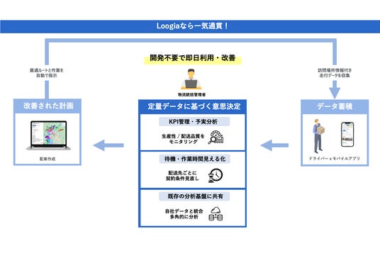 配車計画を紐付けたモバイルアプリ「Loogia動態管理 For ドライバー」を利用し、配送中の訪問場所情報付き走行データを自動取得