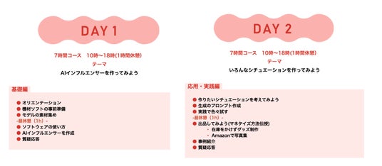 1日目は、作りたいインフルエンサーの企画を行い、AIインフルエンサーを作成する。2日目は、作りたい表情や洋服やシチュエーションのパターンだしを行い、集客方法やマネタイズ方法まで実践で行う。
