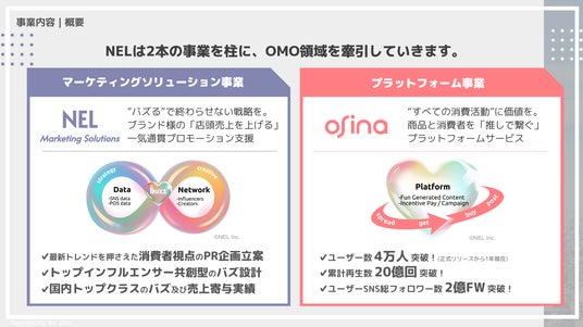NELはデジタル化が進まない大規模場150兆円市場の大手小売店に対して複数のプロダクト・ソリューションで支援を行っております。「マーケティングソリューション事業」「プラットフォーム事業」の2本を柱に、OMO領域を牽引していきます。