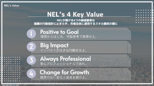 NELが持続的な成長を続けるためのサイクルから、4つの鍵となるバリューを策定いたしました。