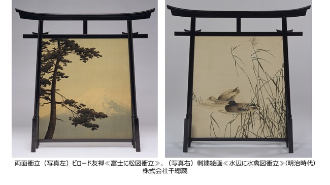 日本画家が描いた下絵をもとに、刺繍職人が針と糸で縫い上げた絵画を、壁掛や衝立などに仕立て製品としました。明治・大正期に盛んに製作され、海外の邸宅を彩る室内装飾品として輸出された、日本が世界に誇る美術工芸品のひとつです。職人が、わずか1cmほどの直線を一針一針、緻密に縫い上げることを繰り返しながら、自在に曲線を描き、染め分けた絹糸の色の濃淡のみで立体感を表現、完成には長い月日がかかったであろうと言われています。