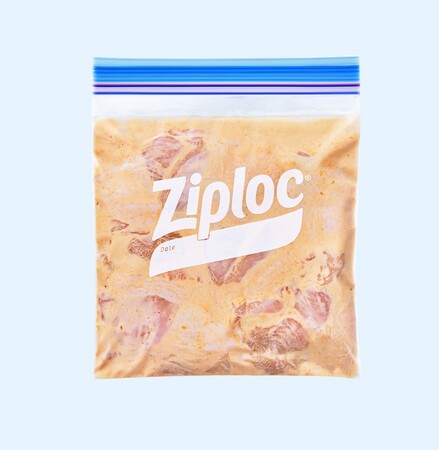 (1)「鶏肉のオーロラソース漬け」にカレー粉を加え、「ジップロック(R)フリーザーバッグ(M)」の上から