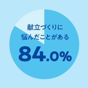 普段から料理を行う300人を対象に、「献立づくり」に関する意識調査を実施したところ、回答者の84.0%が「献立づくりに悩んだことがある」と回答。その理由として、考える時間がないこと、レパートリーが少ないこと、節約・栄養バランスなど考慮しなければいけないことが多くあることなどが悩みの要因となっていることが明らかになりました。特に仕事がある平日は、限られた時間の中での家事・育児に追われ、この悩みが顕在化しやすいことが伺えます。
