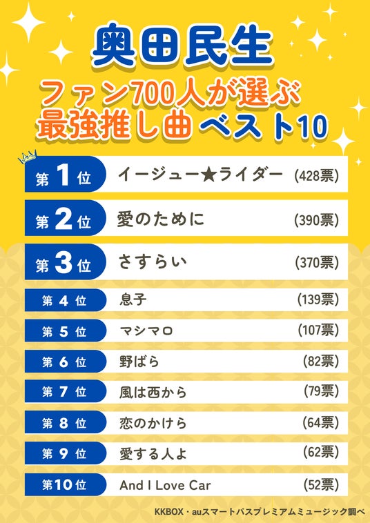 KKCompany Japan合同会社 (所在地:東京都渋谷区、代表:谷 和博)とKDDI株式会社 (所在地:東京都千代田区、代表取締役社長:高橋 誠)が共同運営する音楽配信サービスauスマートパスプレミアムミュージック(以下、auスマプレミュージック)は、奥田民生のソロ30周年を記念し、本サービスで奥田民生の楽曲を聴いているユーザー700人を対象に「奥田民生の最強人気曲」についてアンケートを実施しました。本リリースでは、その結果をご紹介します。