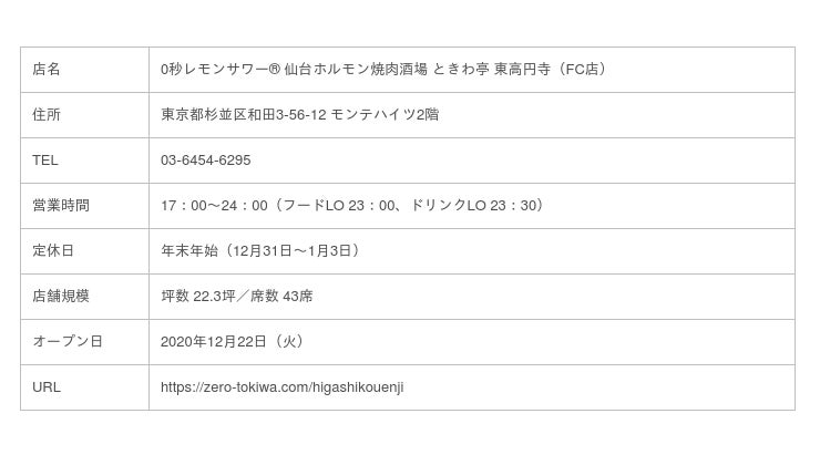 GOSSO株式会社(本社:東京都渋谷区、代表取締役:藤田建)は、12月22日(火)に、「0秒レモンサワー(R) 仙台ホルモン焼肉酒場 ときわ亭 東高円寺店」をオープンします。今年、都市部を中心に出店を進めており、東高円寺店は9店舗目となります。外食機会が減るコロナ禍で、焼肉特有の“ご馳走感”や“エンターテイメント性”が人気を集めています。