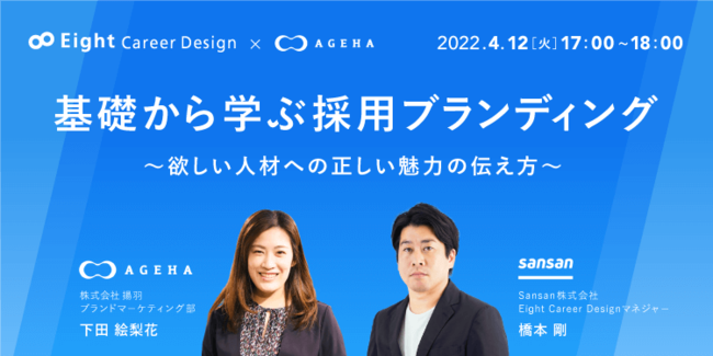 コーポレートブランディング支援を行う株式会社揚羽(東京都中央区八丁堀2丁目12-7 代表取締役社長 湊剛宏 以下、揚羽)は、2022年4月12日(火)に、Sansan株式会社と「基礎から学ぶ採用ブランディング~欲しい人材への正しい魅力の伝え方~」と題したオンラインセミナーを開催いたしました。