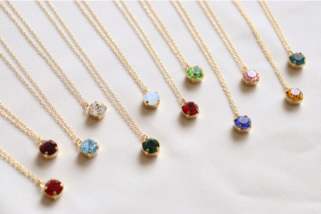 シンプルに輝く一粒の誕生石カラーのクリスタルネックレスは、日常でも身に着けやすく、毎日のお守りとして愛用できるデザインです。