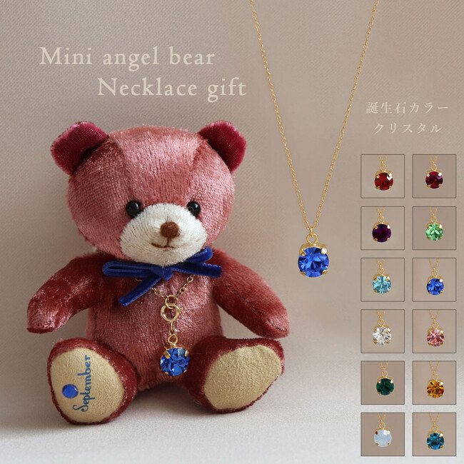 株式会社プティルウは、身長7.5cmの人気のミニエンジェルベアと誕生石カラーのクリスタルネックレスをセットにした「ミニエンジェルベア誕生石クリスタルネックレスギフト」の販売を開始しました。