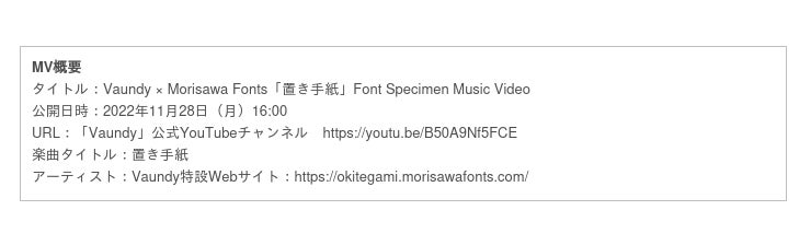 ▶ Vaundy × Morisawa Fonts「置き手紙」Font Specimen Music Video:https://youtu.be/B50A9Nf5FCE
