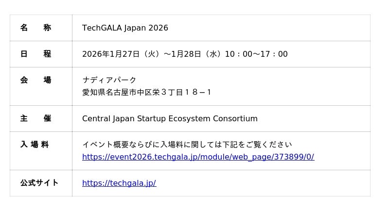 情報を暗号化した上で分散管理する「秘密分散技術」によりデータの保護、データの利活用を追求する株式会社ZenmuTech(ゼンムテック、以下、ZenmuTech)は、2026年1月27日(火)~29日(木)の3日間、愛知県名古屋市で開催される「TechGALA Japan 2026」にブース出展ならびに1月27日(火)のピッチに参加いたします。