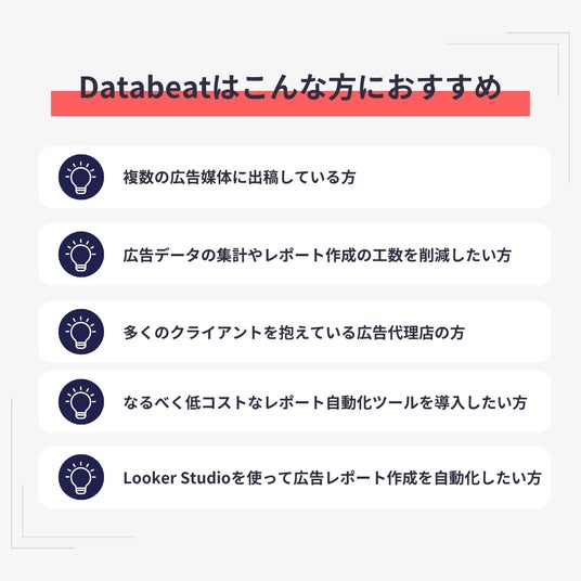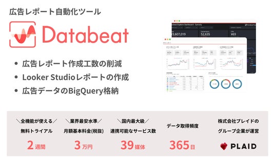 アジト株式会社が開発・提供する広告レポート自動化ツール「Databeat」は、合計39の広告サービスと連携してデータの収集から蓄積、レポート作成を自動化できます。