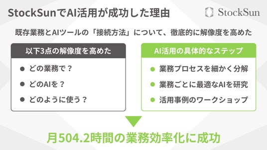 Webマーケティング支援をはじめとしたコンサルティングを提供するStockSun株式会社(本社:東京都新宿区、代表取締役:岩野圭佑)は、AIを活用して「月504.2時間」の業務効率化に成功しました。